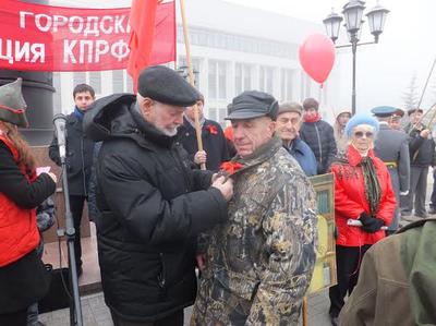 В год 70-летия Великой Победы ветеран партии, участник Великой Отечественной войны Петр Степанович Жарков Под дружные аплодисменты участников митинга вручил памятные медали ЦК КПРФ «Дети войны» Мыльниковой Валентине Афанасьевне, Чистяковой Вере Емельяновне и Заец Михаилу Николаевичу.
