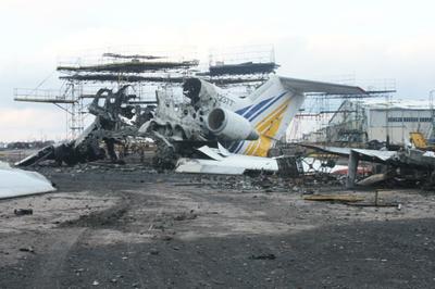 В сопровождении ополченцев из отряда полевого командира «Гиви» нам удалось увидеть последствия боевых действий за Донецкий аэропорт. Некогда современный аэропорт «Донецк» сегодня разгромлен и в результате многочисленных обстрелов превратился в руины. Мы увидели обломки самолетов, уничтоженных во время боевых действий, повсюду лежат развороченные части фюзеляжа.