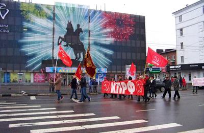 Над митингующими развевались красные флаги и лозунги: «Великому Октябрю – Слава!», «Вернем социальные завоевания Октября!», «Власть – народу! Собственность – трудящимся!», «Нет росту цен и тарифов!», «Программу КПРФ – в жизнь!», «Закон КПРФ «О детях войны!» - в жизнь», «За достойную жизнь! За социальную справедливость!», «Вперед – к социализму!» и другие. Люди скандировали: «Ленин – Партия – Победа».