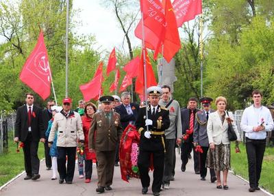 Во время шествия праздничной колонны КПРФ горожан приветствовали здравицами во славу Дня Победы: