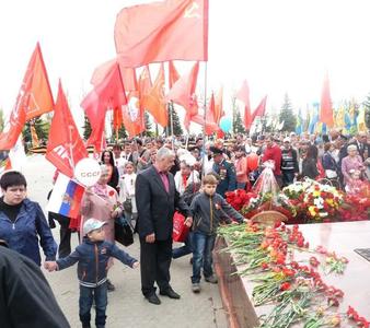 С развевающимися на ветру и хорошо видными издалека красными стягами, активисты КПРФ начали собираться на Соколовой горе часа за полтора до начала официальных мероприятий. Через систему звукоусиления неустанно звучали советские песни военных лет и поздравления горожан с праздником Победы.