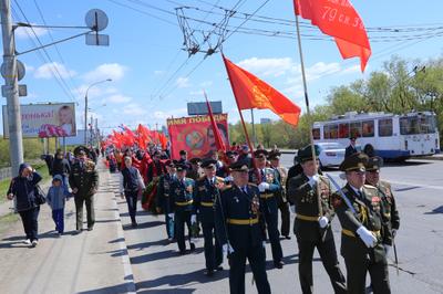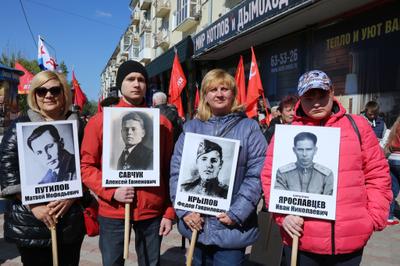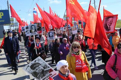 Организованные КПРФ мероприятия проходили параллельно с общегородским шествием «Бессмертного полка». Поэтому многие омские коммунисты выразили желание пронести в «красной» колонне портреты своих родителей и дедов, участвовавших в Великой Отечественной войне. С помощью обкома были изготовлены транспаранты, и, как сказал первый секретарь Омского обкома КПРФ Александр Кравец, в коммунистической колонне прошел «бессмертный батальон». Всего же в колонне двигалось порядка двух с половиной тысяч человек.