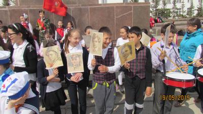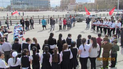 Праздник продолжили пионеры из 7 «б» класса школы №16 Якутска. Они, мастерски пританцовывая, исполнили попурри военных песен: «День Победы!», «Три танкиста!», «Катюша», «Смуглянка», «Синенький платочек» и другие. Пионеры-шестиклассники бойко спели песенку фронтового шофера. Популярные песни подхватывали все, кто пришел в это время на главную площадь.