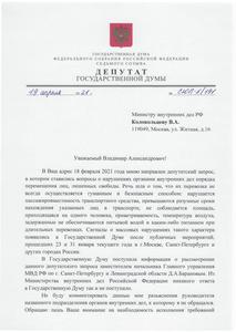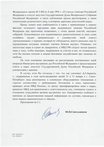 На этом основании настаиваю на рассмотрении поставленных мной вопросов Министром внутренних дел Российской Федерации и предоставлении ответа в адрес депутата Государственной Думы Российской Федерации в соответствии с законом.