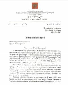 «Прошу Вас предоставить информацию о сложившейся ситуации и принять меры для недопущения нарушения трудовых прав граждан, работающих на предприятиях группы компаний ООО «Востокцемент», — говорится в депутатском запросе, направленном на имя генпрокурора России Юрия Чайки.