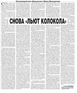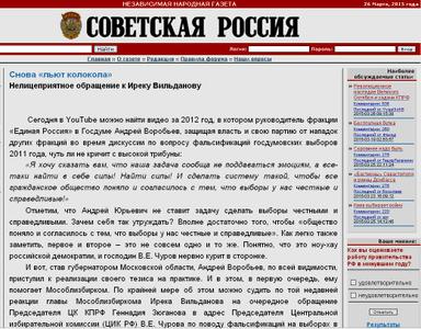 Газета «Советская Россия», № 30 (14125), 26 марта 2015 года опубликовала статью Натальи Еремейцевой, депутата Московской областной думы, первого секретаря Щелковского РК КПРФ "Снова «льют колокола». Нелицеприятное обращение к Иреку Вильданову".