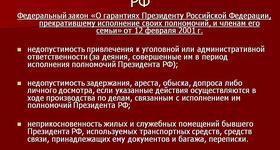 Федеральный закон от 12 февраля 2001 г. № 12-ФЗ (статья 3) наделяет гражданина, прекратившего исполнение полномочий Президента Российской Федерации, неприкосновенностью, которая также распространяется на занимаемые этим лицом жилые и нежилые помещения, используемые им транспортные средства, средства связи, принадлежащие ему документы и личную переписку. Однако это противоречит Конституции Российской Федерации (статья 91), которая устанавливает неприкосновенность только в отношении гражданина Российской Федерации, занимающего должность главы государства действующего Президента Российской Федерации.