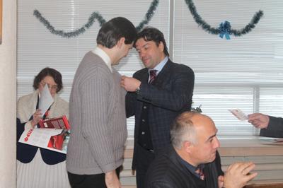 Предновогодняя встреча не могла обойтись без сказочных Деда Мороза и Снегурочки. В рескоме решили сделать их приветствие юмористическим. Началось с комичности и контрастности фигур этих узнаваемых героев. Снегурочкой был высокий симпатичный молодой человек (комсомольский секретарь Алик Хакимов), дедом Морозом – пожилая маленькая женщина (секретарь рескома по идеологии Е.Флорова). Эти персонажи в своем приветствии тоже не ограничились только поздравлением с Новым годом, пожеланиями здоровья и успехов быстрейшей победы над олигархами, но и покритиковали городские власти, не чистящие дорогу, из-за чего наш юрист рескома получил травму, и президента, который кормит народ обещаниями. Немудрящие стихотворные строки и внешний вид Деда Мороза и Снегурочки вызывали смех и еще большую благодарность присутствующих за чудесный праздник, который подарил им наш депутат Александр Андреевич Ющенко!