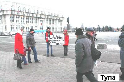 Напомним, что тульские коммунисты уже не раз проводили свои акции против отмены чернобыльских льгот. Наиболее активны в этом проявили себя коммунисты Щекинского района, в котором возможная отмена ударит наиболее сильно. За последние два месяца молодой первый секретарь Щекинского горкома КПРФ, депутат городского собрания депутатов Михаил Тесаков провел серию пикетов, усиливая внимание общественности к этому вопросу.
