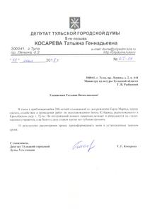 Татьяна Косарева считает, что монумент требует срочных реставрационных работ. Депутат-коммунист обратилась в Министерство культуры Тульской области, в ведении которого находятся памятники, а также к главе администрации Тулы с депутатским запросом. В год двухсотлетия Карла Маркса бюст основоположника социализма должен быть приведён в достойный вид. Татьяна Косарева будет держать этот вопрос на личном контроле.