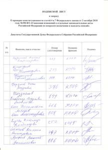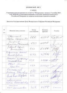 Заявители: нижеподписавшиеся депутаты Государственной Думы Федерального Собрания Российской Федерации седьмого созыва, составляющие в соответствии с частью 2 статьи 125 Конституции Российской Федерации не менее одной пятой депутатов Государственной Думы Федерального Собрания Российской Федерации (адрес заявителей: 103265, г. Москва, ул. Охотный ряд, д. 1).