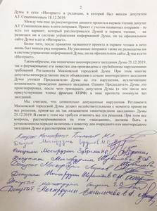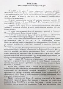 «После пленарного заседания председателем было объявлено внеочередное заседание Московской городской Думы. Возник спор о правомочности данного решения. Ввиду того, что на неоднократное обращение депутатов фракции КПРФ председательствующий не смог зачитать нормы регламента, чтобы избежать дальнейшего скандального развития событий и споров, фракция КПРФ решила покинуть зал заседаний Московской городской Думы в знак протеста.