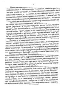 О происхождении огромных средств, которыми распоряжаются указанные благотворительные фонды, Навальный сообщает следующее: "Акционеры "Новатэка" Леонид Михельсон и Леонид Симановский внесли в уставный капитал фонда "Дар" 33 миллиарда рублей. Другой сырьевой олигарх - Алишер Усманов - внес вклад в натуральном эквиваленте: усадьбой в Знаменском на Рублевке. Его вложение равняется 5 миллиардам рублей... Не позднее 2007 года Газпромбанк выдал УК "Дар" кредит на сумму 11 миллиардов рублей... Дочерняя компания "Башнефти" АО "ОНК" выдала "Центрум-Инвесту" 1,7 миллиарда рублей... Вместе с деньгами, полученными от олигархов, объем средств, вращающихся между медведевскими фондами и компаниями, - почти 70 миллиардов рублей".