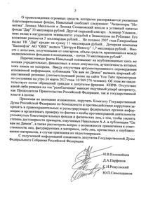 Принимая во внимание изложенное, поручить Комитету Государственной Думы Российской Федерации по безопасности и противодействию коррупции запросить в правоохранительных и регистрирующих федеральных органах информацию и организовать проверку по фактам о якобы противоправной деятельности упомянутых благотворительных фондов и физических лиц, с тем, чтобы уяснить степень достоверности примеров, озвученных Навальным А.А. в публикации "Он вам не Димон", а также рассмотреть вопрос о возможности привлечения к ответственности лиц, фигурирующих в материале, либо лиц, причастных к опубликованию материалов, в случае признания их недостоверными.