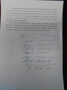 Просим Вас незамедлительно в рамках закона и Вашей компетенции обеспечить соответствие деятельности Центрального банка законодательству Российской Федерации и долгосрочным интересам развития страны, в т.ч. рассмотреть вопрос о смене состава органов управления Банка России.