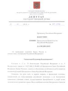 Группа депутатов фракции КПРФ в Госдуме направила обращение Президенту РФ В.В. Путину с требованием отправить в отставку руководство Центробанка. Под обращением поставили свои подписи депутаты В.Ф. Рашкин, С.П. Обухов, О.Н. Алимова, А.А. Кравец, В.Н. Иконников, Н.А. Кузьмин, А.А. Ющенко, Н.В. Коломейцев, К.А. Лазарев. Копия этого обращения направлена Председателю Правительства РФ Д.А. Медведеву.