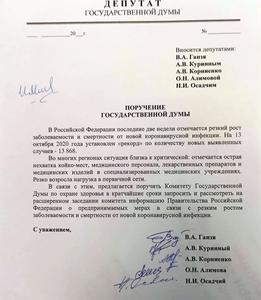 Депутат Госдумы ФС РФ О.Н. Алимова вместе с коллегами по фракции КПРФ: В.А. Ганзя, А.В. Куринным, А.В. Корниенко и Н.И. Осадчим внесли протокольное поручение федеральному парламенту, где предлагается поручить Комитету Государственной Думы по охране здоровья в кратчайшие сроки запросить и рассмотреть на расширенном заседании комитета информацию Правительства РФ о предпринимаемых мерах в связи с резким ростом заболеваемости и смертности от новой коронавирусной инфекции и потребовать от Правительства РФ более серьёзных и ответственных мер.