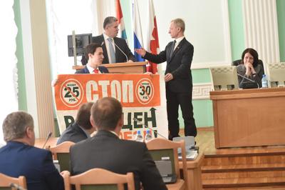В тот момент, когда во время обсуждения вопроса о повышении цен на проезд в общественном транспорте с 22 до 25 рублей по электронному проездному и 30 рублей за наличный расчет на трибуну Омского горсовета поднялся новый директор департамента транспорта мэрии Александр Вялков, а депутатам было предложено задавать вопросы, к трибуне вышли депутаты-коммунисты Иван Федин и Кирилл Курятников.