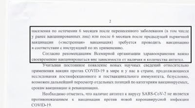 Согласно рекомендациям Всемирной организации здравоохранения важно своевременно вакцинироваться вне зависимости от наличия и количества антител», - сообщается в ответе вице-премьера на депутатские запросы "Народной приемной" .