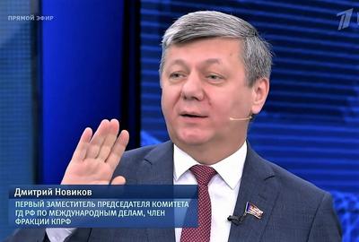 2 февраля в эфире программы «Время покажет» на «Первом канале» обсуждалась отношения между Россией и Западом на фоне нарастания международной напряжённости, а также обвинения в адрес России в желании «восстановить советскую империю». В обсуждении принял участие заместитель Председателя ЦК КПРФ, первый заместитель председателя Комитета Государственной Думы по международным делам Дмитрий Новиков.