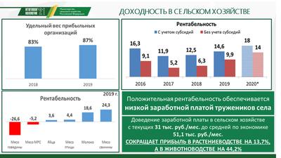 При этом вся рисуемая статистикой доходность хозяйств держится лишь на нищенской заработной плате. Если вывести заработную плату сельскохозяйственных работников с текущих 31 тыс. рублей в месяц на уровень средней по экономике, 51 тыс. рублей в месяц, то прибыль в растениеводстве сразу же упадет на 14%, а в животноводстве почти на все 45%! Хочу, чтобы все сегодня это увидели и запомнили, что экономика сельского хозяйства у нас складывается за счет удержания людей в состоянии нищеты!