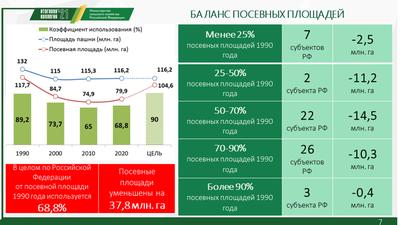 От не так давно участвовавших в севообороте 117 млн. гектаров у нас сегодня используется всего 80 млн. га. В семи субъектах Российской Федерации от прежних посевных площадей используется меньше 25%! Брошено 37,8 млн. га пашни.