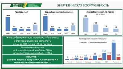 Дмитрий Николаевич в своем докладе сказал: «…наконец-то нам удалось увеличить парк сельскохозяйственной техники». Но данные Росстата все-таки говорят об обратном. Количество тракторов и комбайнов медленно, но продолжает снижаться. А если взглянуть на нашу энерговооруженность в расчете на 1000 гектар, то мы увидим насколько мы уже отстали и от Германии, и от США. Даже от Беларуси и Казахстана мы в 2-3 раза отстаем! Поэтому и уборка урожая у нас затягивается на несколько месяцев, и потери урожая на поле достигают 25%. А ведь у нас теперь официально поставлены цели вовлечения заброшенных земель, в связи с чем, и энергетическая вооруженность должна отреагировать.