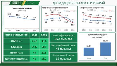 Почему сегодня все находится в плачевном состоянии? Почему население сокращается, коэффициент смертности идет в пике, нищета зашкаливает и уже в 2 раза выше, чем в городе, в 5 раз сократилось число больниц, на 13 тыс. ФАПов? Уже районные больницы разваливаются! Специалисты на селе заканчиваются, и, даже в Подмосковье, уже летучие отряды заняты на сельскохозяйственных работах, как на северах нефтяники!