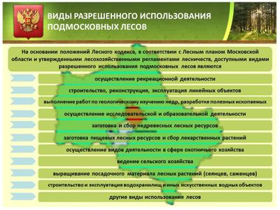 На основании положений Лесного кодекса, в соответствии с Лесным планом Московской области и утвержденными лесохозяйственными регламентами лесничеств, доступными видами разрешенного использования подмосковных лесов являются: