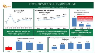 В результате сегодня мы добываем без малого 5 миллионов тонн водных биоресурсов, и это далеко не предел. При этом наши научно обоснованные пределы находятся в районе 8 млн. тонн. Это позволит нам поднять и потребление, которое сейчас на уровне нормы в 22 кг. на человека в год, но, тем не менее, еще очень далеко от таких стран, как Норвегия, Китай, других, в том числе европейских, государств.