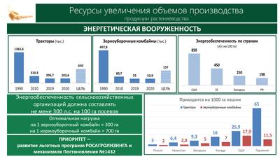 Сегодня благодаря эффективным механизмам обновления парка сельскохозяйственной техники нам удалось затормозить падение на этом направлении. Сейчас мы на отметке в 204 тысячи тракторов и 54 тысячи комбайнов при общей энерговооруженности в 198 л.с. на 100 га. А ведь всего 30 лет назад на 100 га наши мощности в сельском хозяйстве составляли больше 300 лошадиных сил. Теперь же в Белоруссии в 2,5 раза больше комбайнов, чем у нас, и в 3 раза больше тракторов. А если взять Соединённые Штаты Америки, то мы увидим восьмикратный разрыв. Германия вообще за пределами каких-либо сравнений.
