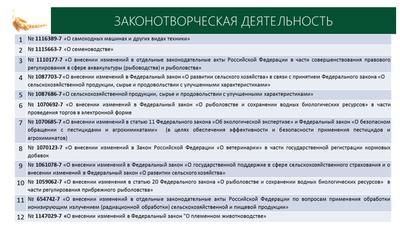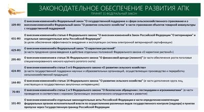 Это 31 законодательный акт, в том числе Закон «О зерне», «О племенном животноводстве», «О плодородии почв», «О пчеловодстве» и многие другие. Это все базовые законы, над обеспечением эффективной правоприменительной практики которых мы работаем вместе с Министерством сельского хозяйства.