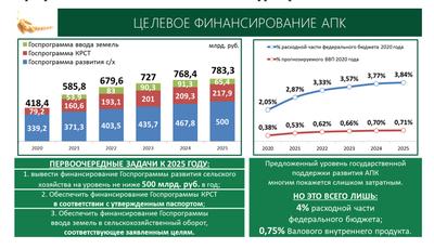 Мы много не просим, мы даже говорим через эти системные вещи, мы выходим на уровень 0,75% ВВП или 4% расходной части федерального бюджета, при том, что в Советском Союзе меньше 15% на сельское хозяйство не давали. Мы просим вполне посильные для бюджетной системы средства, которые обеспечат прорыв в производстве сельскохозяйственной продукции и социально-экономическом развитии сельских территорий. Причем эти средства через новые урожаи, новые рабочие места, насыщение обрабатывающей промышленности сырьем, старицей вернутся в бюджет через налоги.