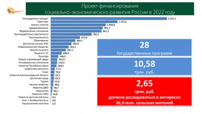 У нас 28 государственных программ, на которые идет почти 11 триллионов рублей в год. У нас на селе постоянно проживает 37 миллионов человек, а в теплые 7 месяцев в месте с приезжими из города, так, вообще, 90 миллионов человек! С апреля все дачники приедут в деревню, а там нет медпункта, ни магазина приличного, ни дорог, ничего. А это же наши люди, в том числе пенсионеры!