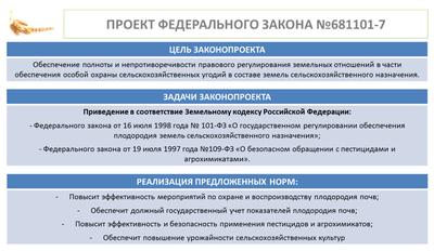 Данным законопроектом мы устраняем существенные противоречия между Федеральным законом «О государственном регулировании плодородия почв земель сельскохозяйственного назначения» и Земельным кодексом Российской Федерации, исключаем неоднозначные толкования и фактически правовую неопределенность в распределении прав и обязанностей землепользователей, которые сегодня не позволяют системно вести работу по охране и воспроизводству плодородия почв.