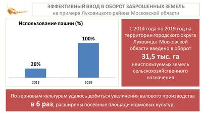 Вот, у нас есть Луховицкий район Московской области. Там за последние 5 лет было введено в оборот 31,5 млн. га неиспользуемых земель сельскохозяйственного назначения. Благодаря этому, к сегодняшнему дню, на территории района уже нет неиспользуемой пашни. В 6 раз в районе было увеличено валовое производство зерновых! Рядом с ним идет Зарайский район.
