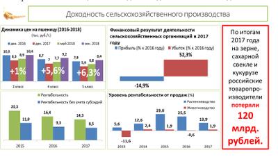 Цена на пшеницу только сейчас вернулась на уровень 2016 года: третий класс — около 10 тыс. рублей за тонну, четвертый класс – около 9 тыс. рублей, пятый класс –8 тыс. рублей. В результате только за прошлый рекордный по урожаю год наши крестьяне потеряли более 120 миллиардов рублей.