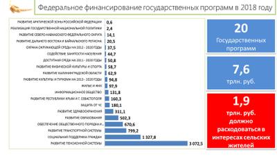 Таких программ сегодня 20, и по ним на цели социально-экономического развития страны расходуется 7,6 трлн. рублей. При том, что в России 38 миллионов граждан живет в сельской местности (25% населения), на развитие села должно направляться 1,9 трлн. рублей! Тогда на селе появятся дороги, жилье, детские сады и школы, больницы, новые деревни, производственные центры, и многое другое.