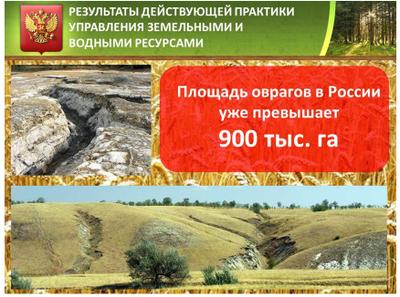 Нарастают темпы оврагообразования. Площадь оврагов в России уже превышает 900 тыс. га. По экспертным оценкам наиболее активные эрозионные процессы наблюдаются в Приволжском, Южном и Центральном федеральных округах, дефляция – в Сибирском и Южном федеральных округах, засоление – в Южном и Сибирском федеральных округах.