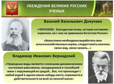 Великие русские ученые-классики в своих трудах неоднократно писали о великой ценности, которую представляют собой земли, почвы, леса и водные системы, об их уникальных свойствах и глубокой взаимосвязи.