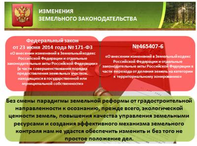 Так, под благовидным предлогом рационального не истощительного природопользования в Государственной Думе появился проект федерального закона № 444365-6 «О внесении изменений в Земельный кодекс Российской Федерации и отдельные законодательные акты Российской Федерации в части совершенствования порядка предоставления земельных участков, находящихся в государственной или муниципальной собственности» (ПРИНЯТ). В совокупности с внесенным в Государственную Думу законопроектом № 465407-6 «О внесении изменений в Земельный кодекс Российской Федерации и отдельные законодательные акты Российской Федерации в части перехода от деления земель на категории к территориальному зонированию» (РАССМОТРЕНИЕ ПЕРЕНЕСЕНО) он сводит все прежние усилия по формированию эффективной земельной политики к нулю, существенно трансформируя положения земельного и смежного законодательства.