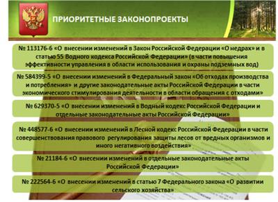 - № 448577-6 «О внесении изменений в Лесной кодекс Российской Федерации в части совершенствования правового регулирования защиты лесов от вредных организмов и иного негативного воздействия»;