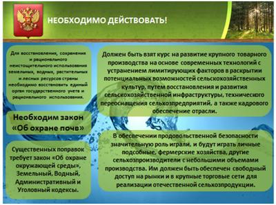 Необходим закон «Об охране почв», который, кстати, в настоящее время разрабатывается Министерством природных ресурсов и экологии Российской Федерации и профильным Комитетом.