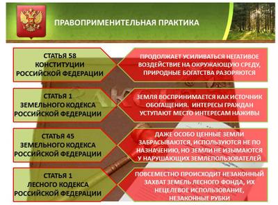 Тем не менее, повсеместно практикуется хищнический подход к природопользованию, земля воспринимается многими собственниками исключительно как источник наживы, повсеместно происходит захват земель лесного фонда, их нецелевое использование, незаконные рубки лесных насаждений.
