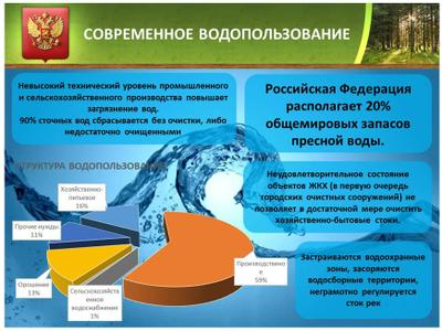 Несмотря на то, что Россия обладает уникальным водно-ресурсным потенциалом (20% общемировых запасов пресной воды) и является глобальным донором водных ресурсов, в связи со сложившейся практикой водопользования это природное богатство может быть истощено или безвозвратно утрачено.