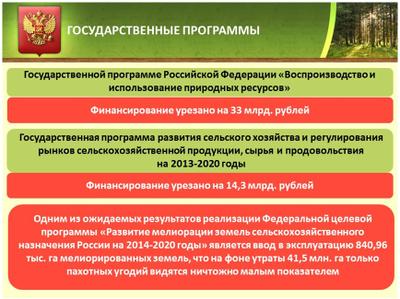 В этой связи считаю необходимым заострить Ваше внимание на следующих двух программных документах - Государственной программе Российской Федерации «Воспроизводство и использование природных ресурсов» и Государственной программе Российской Федерации «Государственная программа развития сельского хозяйства и регулирования рынков сельскохозяйственной продукции, сырья и продовольствия на 2013-2020 годы».