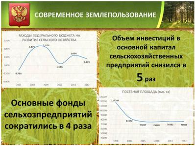 Объем инвестиций в основной капитал сельскохозяйственных предприятий снизился в 5 раз, уровень государственной поддержки агропромышленного комплекса с 1990 года в среднем упал в 10 раз - до 1,48% расходов федерального бюджета, основные фонды сельхозпредприятий сократились в 4 раза, посевные площади уменьшились на 41,5 млн. га (46%).