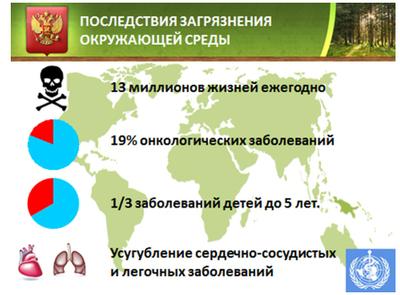 Не следует также забывать о том, что качеством среды обитания определяется уровень здоровья человека. По данным Всемирной ассоциации здравоохранения, неблагоприятные факторы окружающей среды являются причиной 13 миллионов смертей ежегодно.
