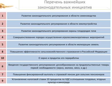 Депутаты подготовили законопроекты, направленные на охрану и воспроизводство плодородия почв, на развитие агролесомелиорации. Совместно с Министерством сельского хозяйства депутаты работают над законодательным регулированием в области семеноводства, над законом о зерне и продуктах его переработки. Причем считаю необходимым по этим законопроектам создать рабочую группу с участием представителей науки и активно двигать вопрос к внесению в Государственную Думу и последующему принятию закона.