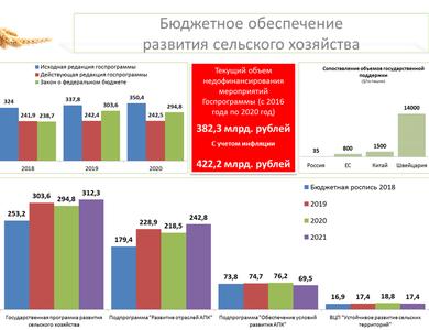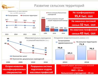 На сельских территориях проживает 38 млн. человек, это 24% населения России. И что вы думаете? После всех состоявшихся обсуждений и выражений озабоченности этим вопросом, в 2019 году на цели устойчивого развития сельских территорий из федерального бюджета хотели выделить всего 17 млрд. рублей. А ведь исходя из количества сельских жителей и бюджетной обеспеченности программ социально-экономического развития Российской Федерации (7,6 трлн. руб. в 2018 году), на цели развития сельских территорий должно направляться не менее 1,9 трлн. рублей!